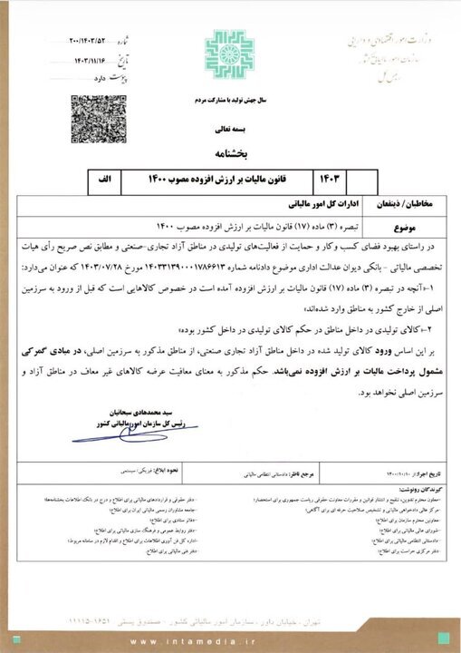 به گزارش ایلنا، در این بخشنامه آمده است: در راستای بهبود فضای کسب و کار و حمایت از فعالیتهای تولیدی در مناطق آزاد تجاری صنعتی و مطابق نص صریح رأی هیئت تخصصی مالیاتی - بانکی دیوان عدالت اداری موضوع دادنامه شماره ۱۴۰۳۳۱۳۹۰۰۰۱۷۸۶۶۱۳ مورخ ۱۴۰۳/۰۷/۲۸ که عنوان میدارد: