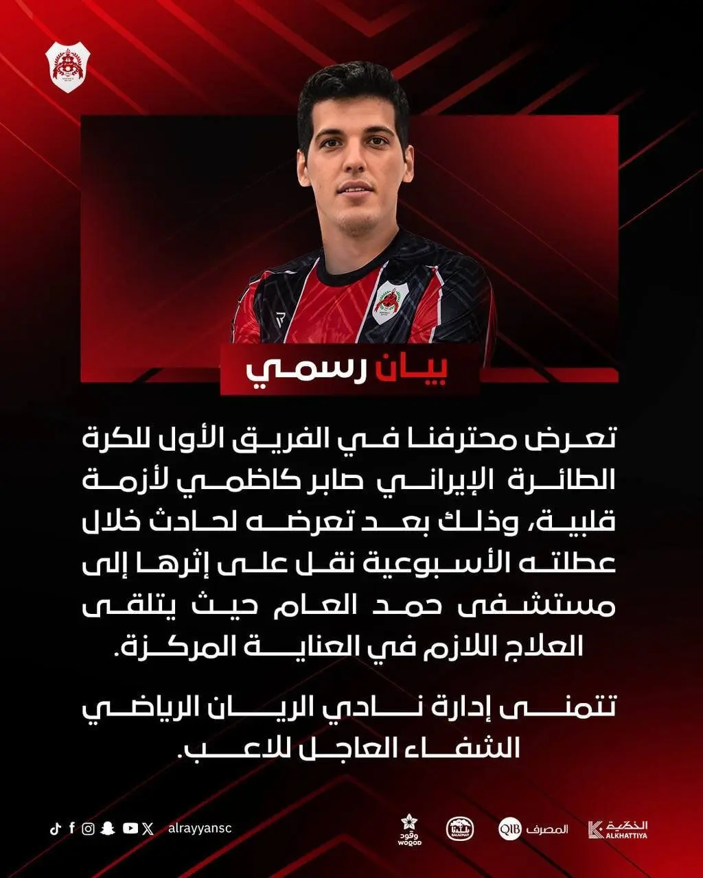 صابر کاظمی، بازیکن تیم والیبال الریان، پس از بروز عارضه قلبی در تعطیلات آخر هفته، به بیمارستان حمد العام منتقل و در بخش مراقبتهای ویژه بستری شد.